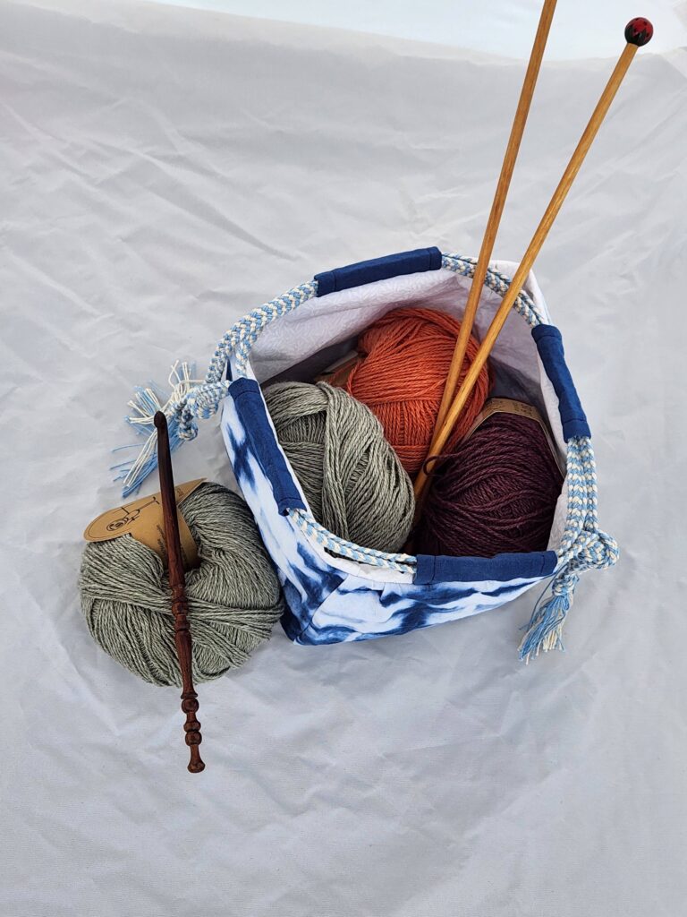 Tye Dye Indigo blue Shibori bag with Kumihimo cord. 100% Repurpose Cotton fabric.